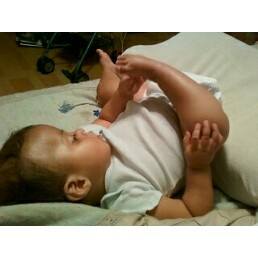 As you notice in the picture, he has discovered his toes!! We have to prop his hiney up to get it there but he LOVES them!